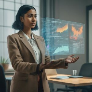A businesswoman presenting a financial report on a holographic display, with data visualizations powered by AI analytics.