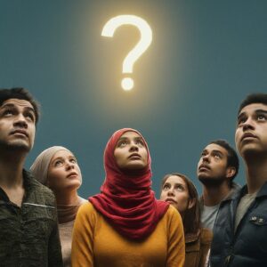 A diverse group of people, including a woman with a headscarf and a Latino man, looking up at a glowing question mark in the sky, symbolizing the curiosity and vastness of AI.