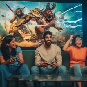 A group of friends from different ethnicities playing an AI-powered video game together.